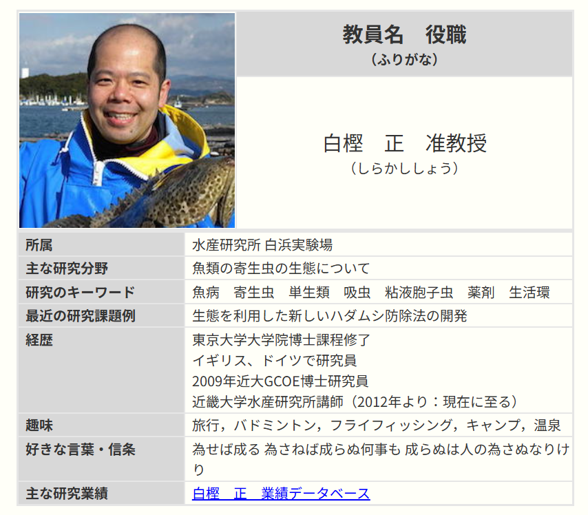 白樫容疑者は、近畿大学の公式ホームページや研究者紹介ページに顔画像が掲載されています。