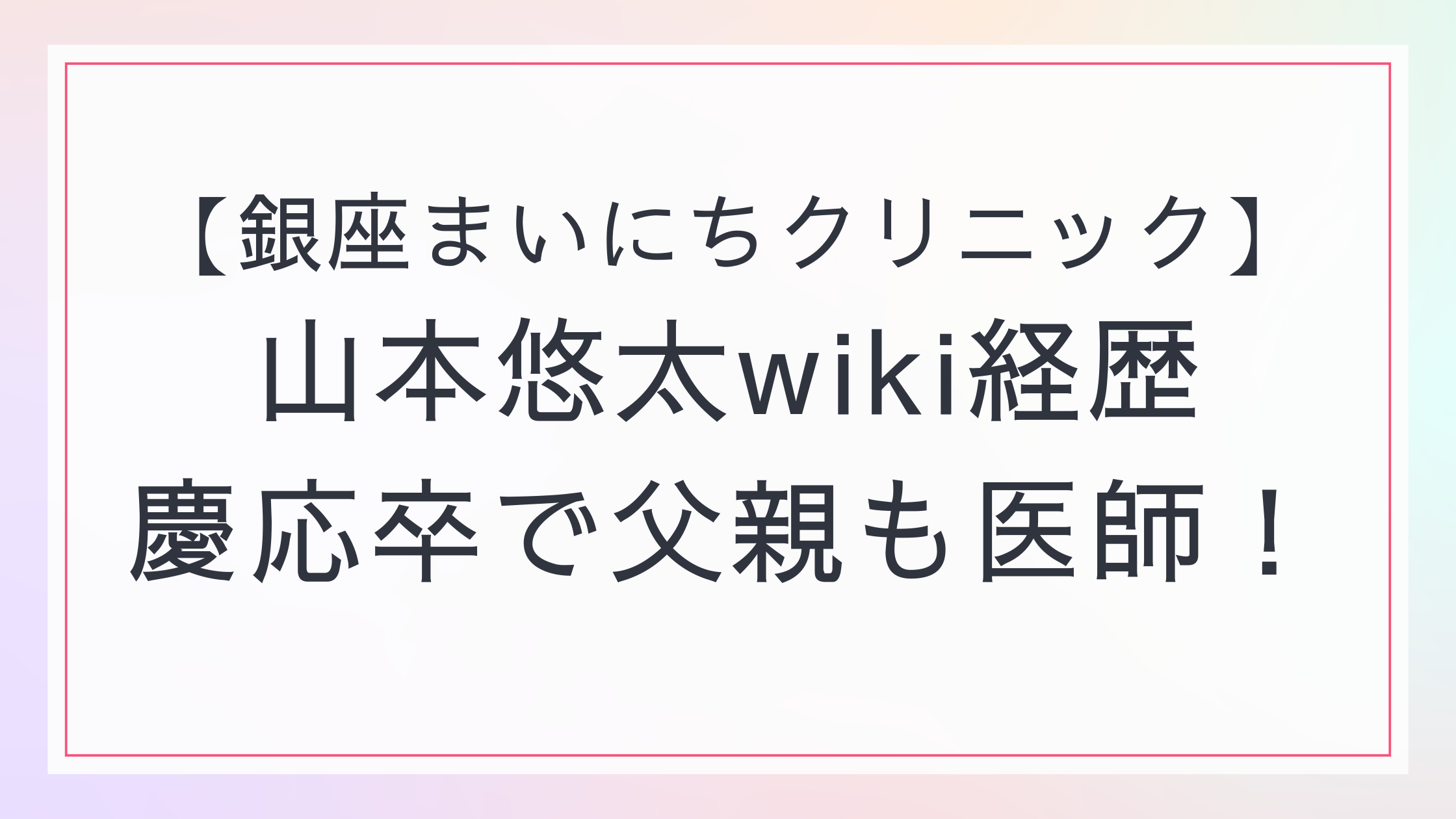 この記事では、「銀座まいにちクリニック」山本悠太院長の経歴やプロフィール、父親の情報などをまとめました。